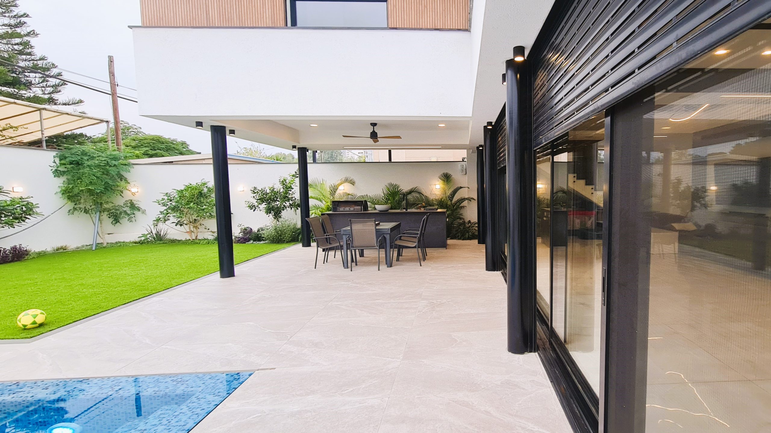 תכנון אזורי ישיבה מוצלים בסמוך למים, פינות ברביקיו או מטבח חוץ, ואפילו בר שרות ליד הבריכה – כל אלה הופכים את החצר למרכז חיי המשפחה.